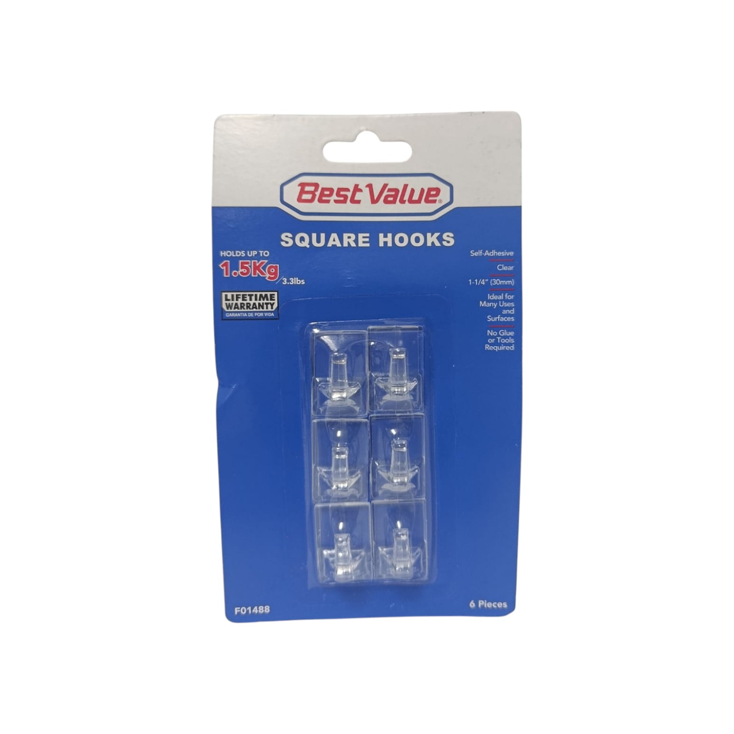 GANCHO ADHESIVO BEST VALUE CUADRADO TRANSPARENTE 30 MM 6 UND